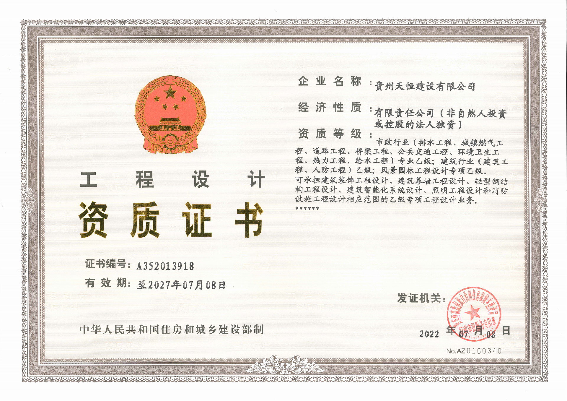 貴州天恒建設(shè)有限公司資質(zhì)范圍及等級(jí):